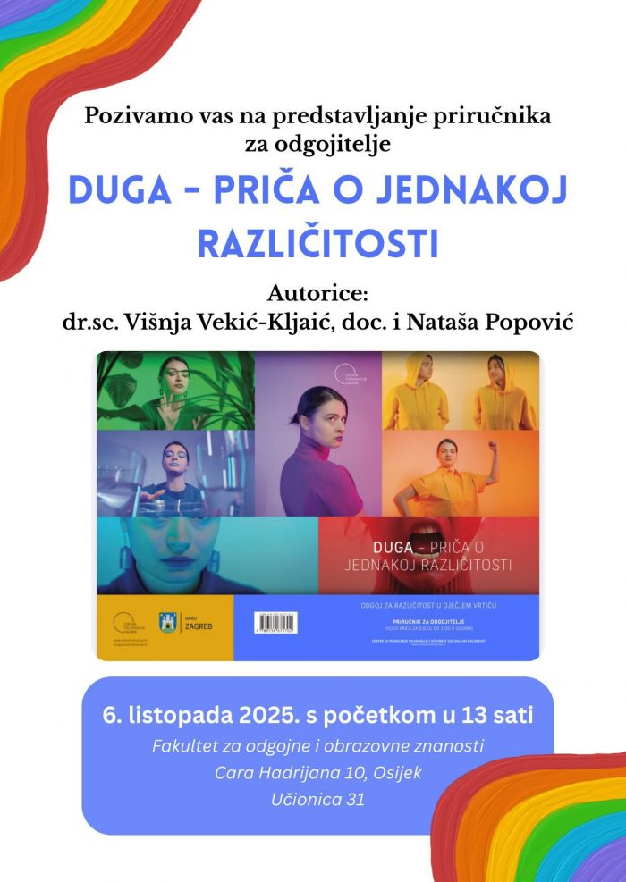 Centar za promicanje tolerancije objavio je priručnik za odgojitelje pod naslovom Duga – priča o jednakoj različitosti. Odgoj za različitost u dječjem vrtiću autorica dr. Višnje Vekić-Kljaić i Nataše Popović. Promocija priručnika održat će se 6. listopada 2025. u Osijeku, na Fakultetu za odgojne i obrazovne znanosti.