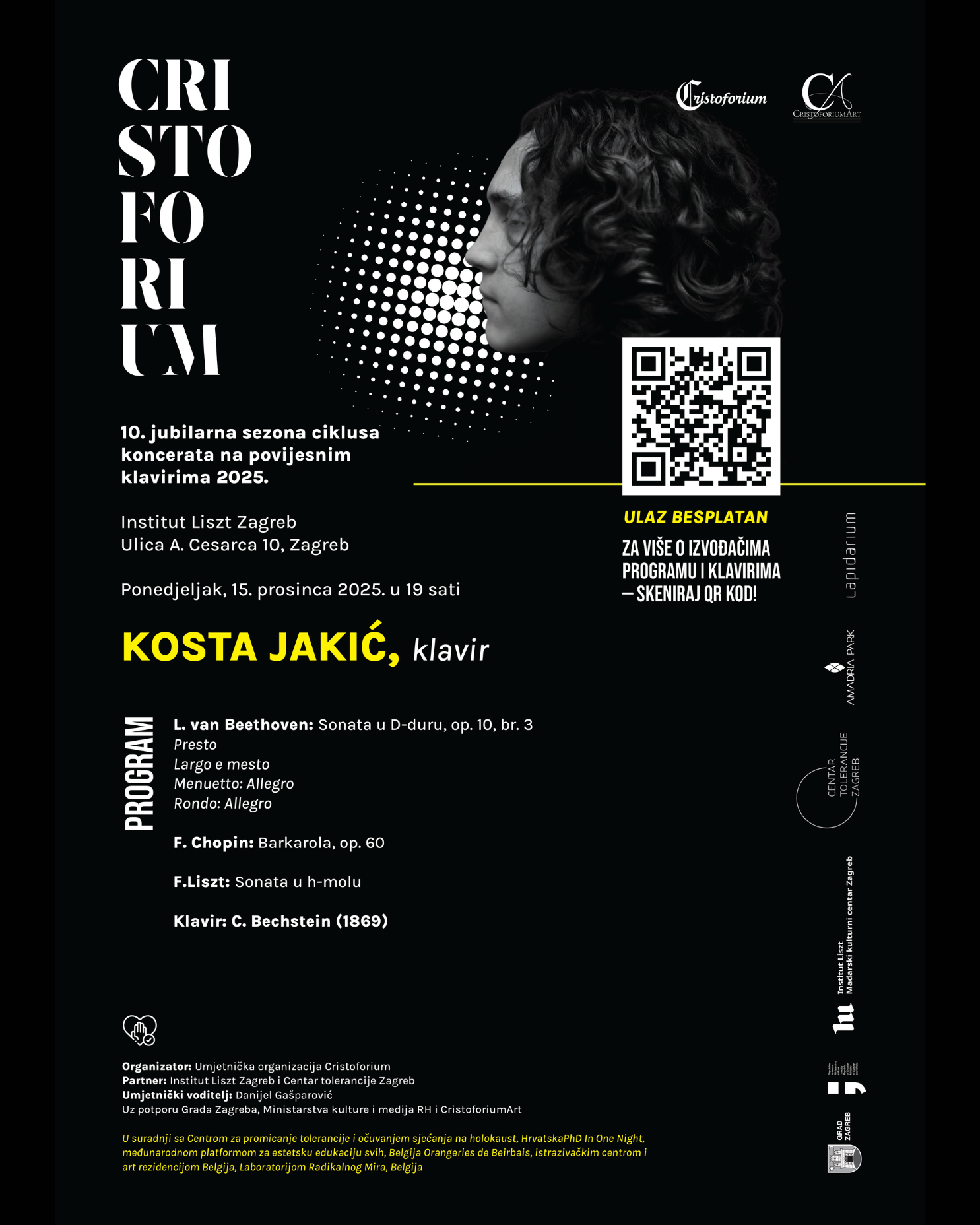 Istog dana, u 19 h u Institutu Listz Kosta Jakić održat će koncert u sklopu programa Cristoforium – 10. jubilarne sezone ciklusa koncerata na povijesnim klavirima 2025. Na programu su djela Beethovena, Chopina i Liszta, a organizator koncerta je Umjetnička organizacija Cristoforium.